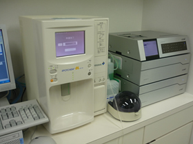 HbA1c、血糖、血球、炎症反応(CRP)、検尿は院内ですぐ検査できます。生化学検査も緊急性の高いものは院内で行い当日結果がでます。心電図、血圧脈波検査、頸動脈・心臓・腹部エコー、24時間心電図、24時間血圧検査機器、睡眠時無呼吸検査機器があります。