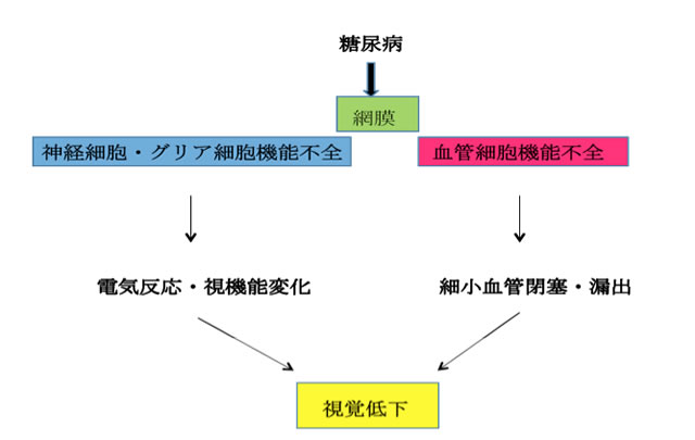 しかし網膜はもともと血管組織ではなく網膜神経、グリア細胞、血管が絡みあった機能的神経血管組織であり、近年糖尿病性網膜症において神経変性が細小血管障害に先行するという報告も見られます (1)(2)。